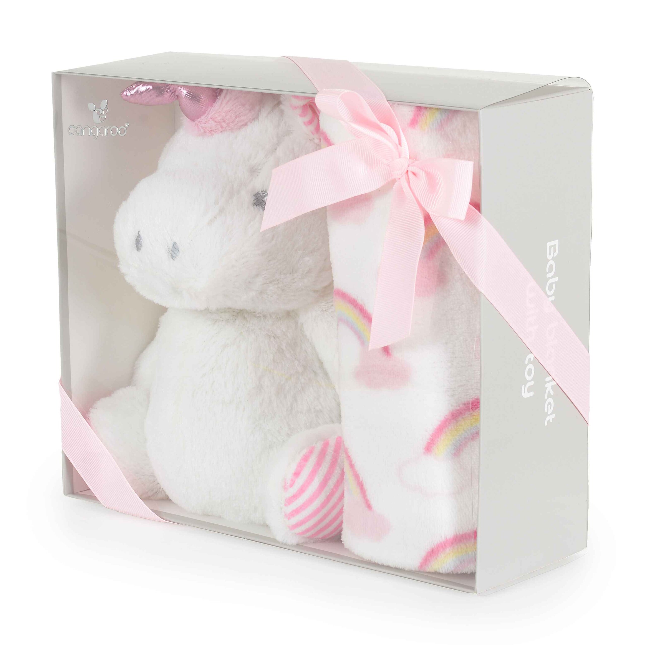 Mekana i topla dječja dekica s uzorkom duge i plišani jednorog.