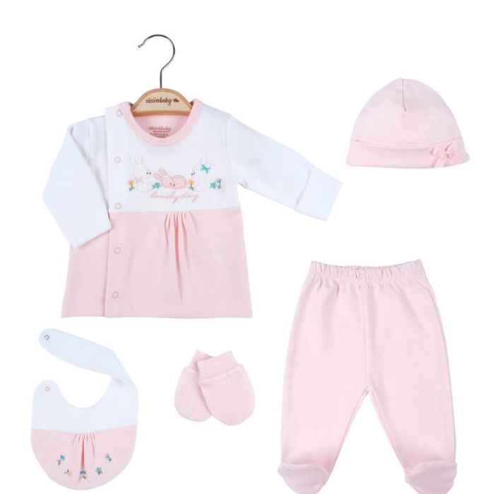 Preslatki komplet od 5 dijelova u nježnim tonovima idealna je kombinacija za bebine prve dane!
