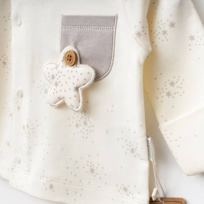 Komplet je ukrašen aplikacijom zvjezdice koja mu daje poseban i nježan izgled. Materijali su mekani, prozračni i sigurni za bebe, a u isto vrijeme i idealni za svakodnevno nošenje i spavanje.