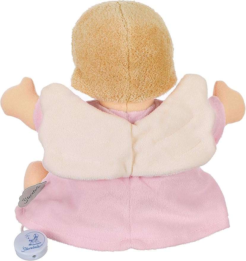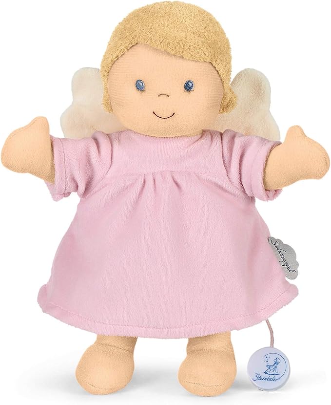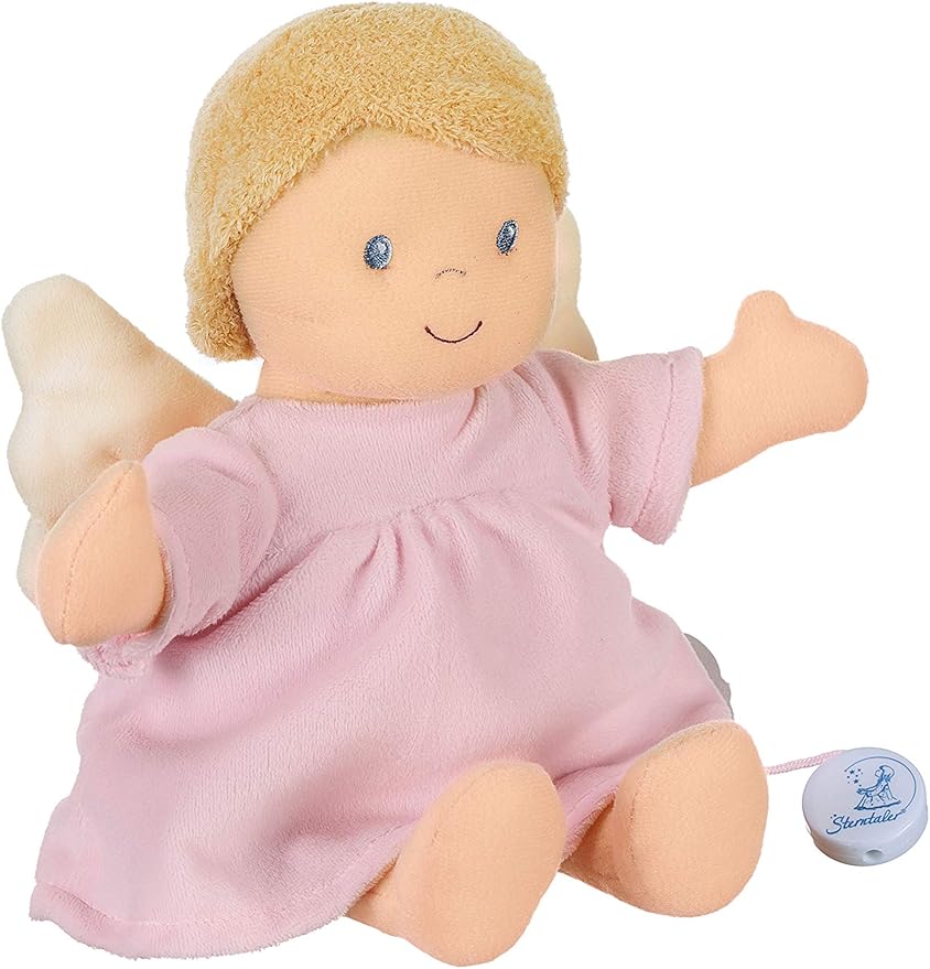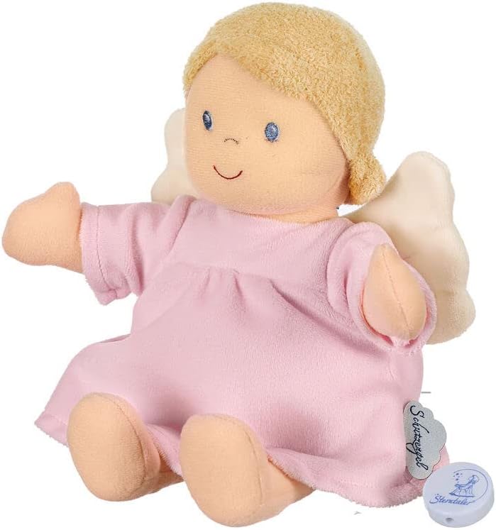 Svira glazbu koja umiruje bebu, a tkanina anđela je nježna i idealna za maženje.