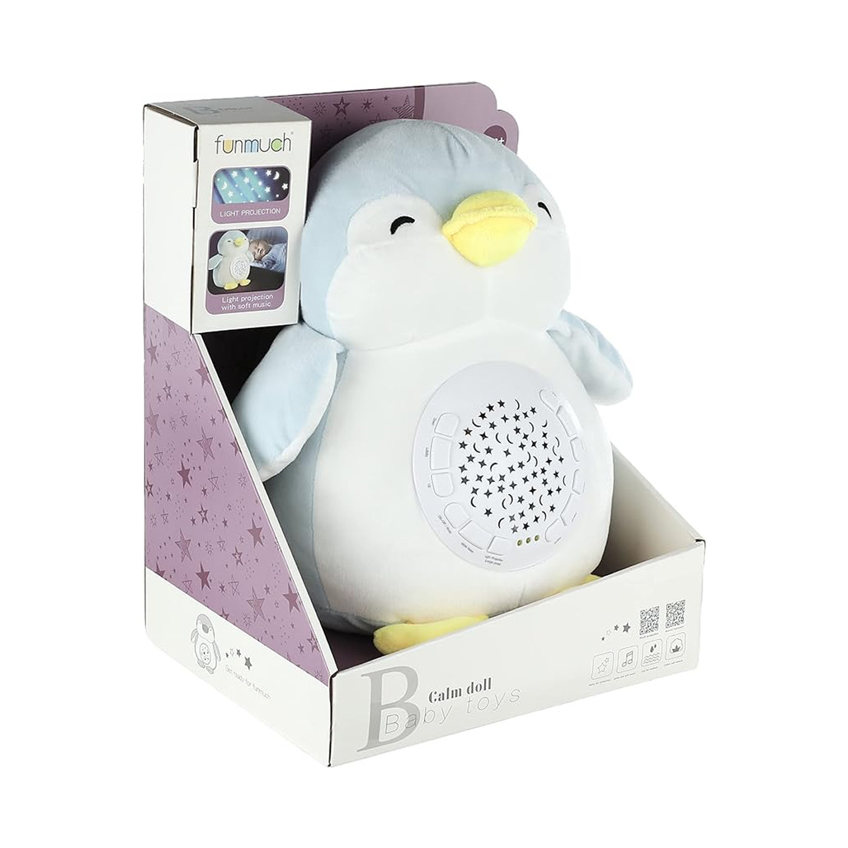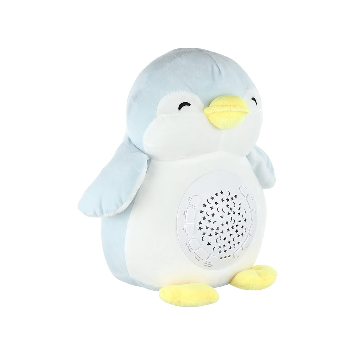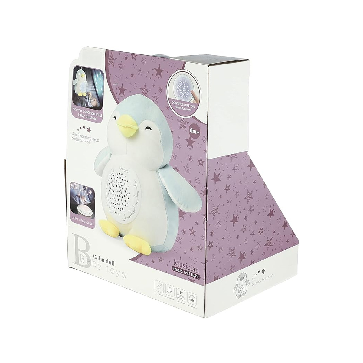 Plišani pingvin s projektorom i glazbenom kutijom na trbuhu.