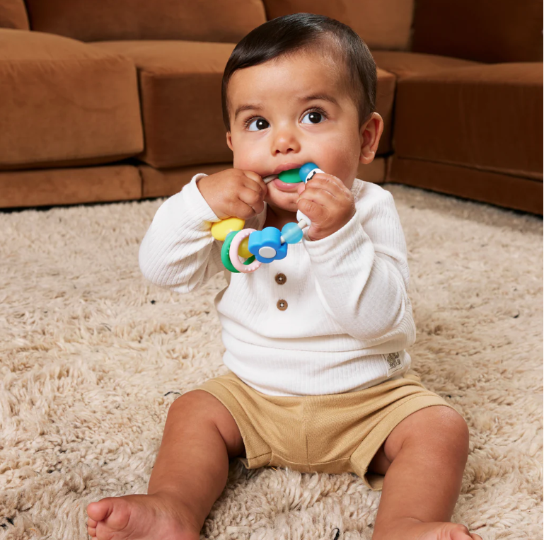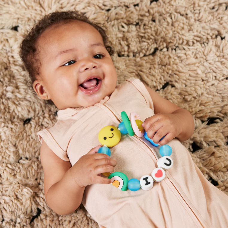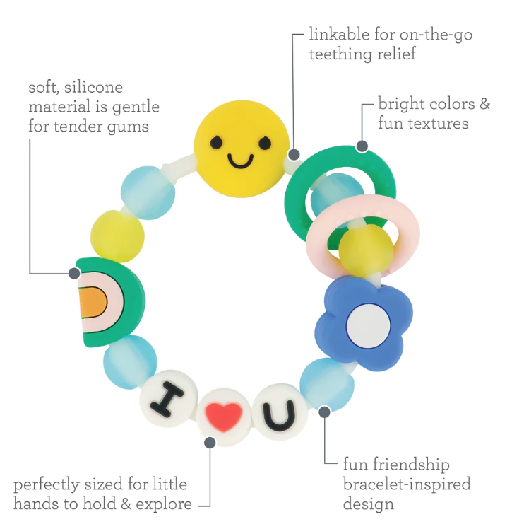 Sa svojim zabavnim dizajnom inspiriranim narukvicom prijateljstva, ova glodalica je savršen pratitelj za vrijeme nicanja zubića!
