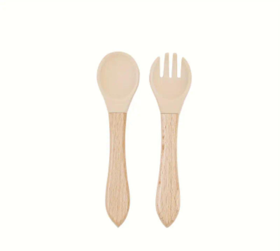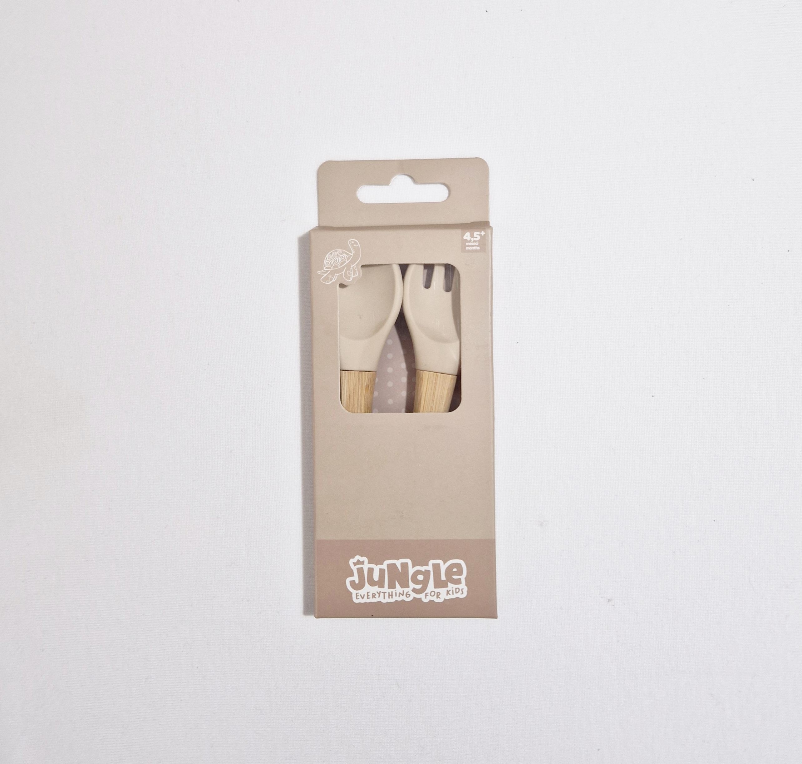 Jungle 2-dijelni silikonski pribor za jelo s drvenom drškom sadrži žlicu i vilicu (dimenzije 3,4×14,2 cm) – ugodne na dodir i prilagođene malim ručicama.