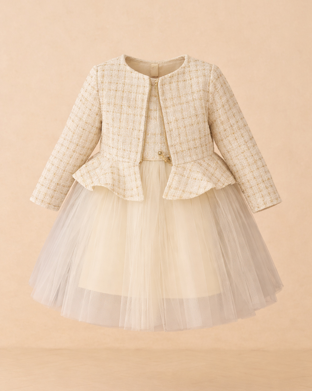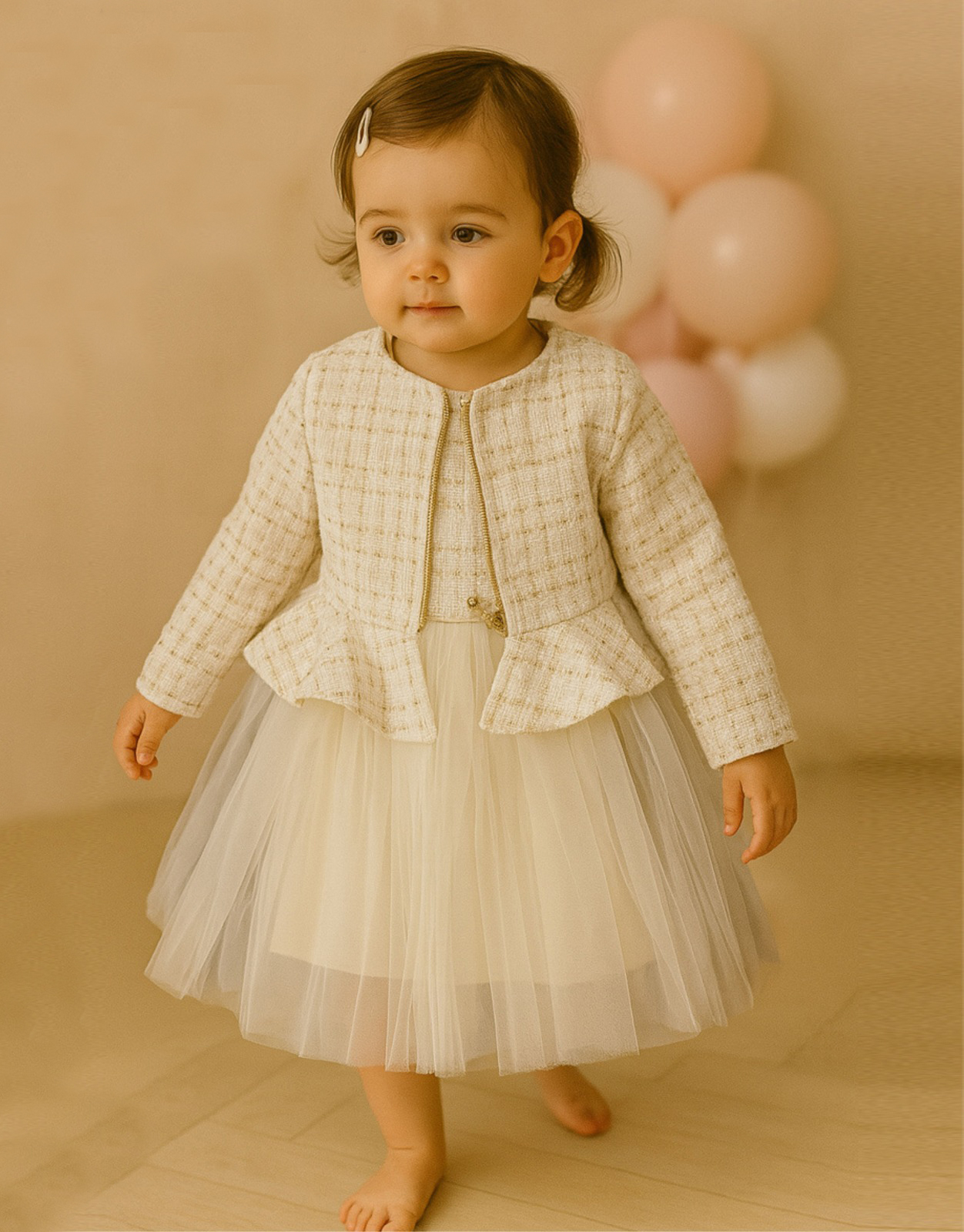 Elegantan komplet koji se sastoji od haljine kratkih rukava i jaknice, savršen za posebne prilike poput proslava, krštenja ili obiteljskih okupljanja.