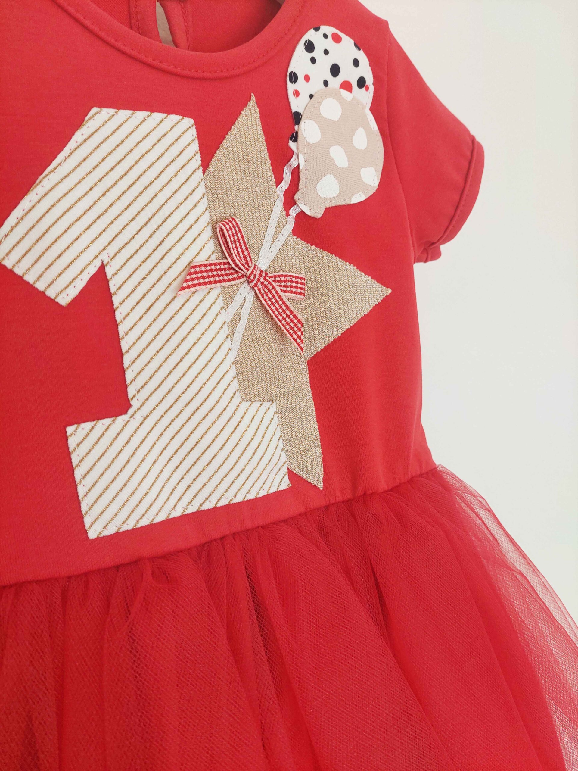 Prednji dio haljine krasi aplikacija broja 1 ukrašena sjajnim detaljima i balonima, što je čini idealnom za nezaboravne rođendanske fotografije.