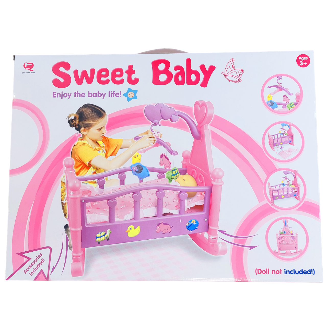 Set uključuje krevetić, posteljinu, bočice, dudu i vrtuljak.