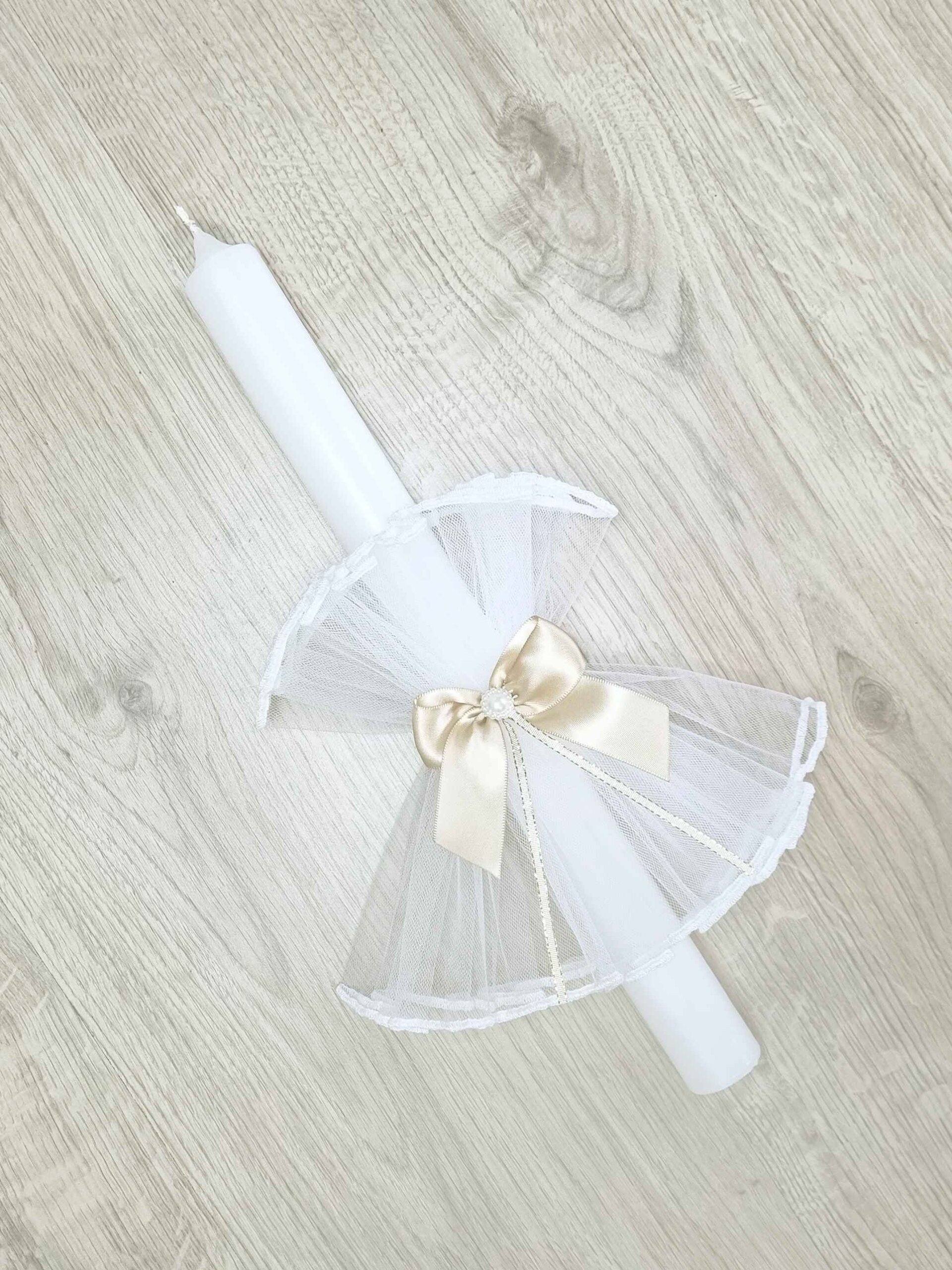 Kretex svijeća za krštenje ukrašena je tilom i mašnom koja na sredini ima ukras u obliku bisera.
