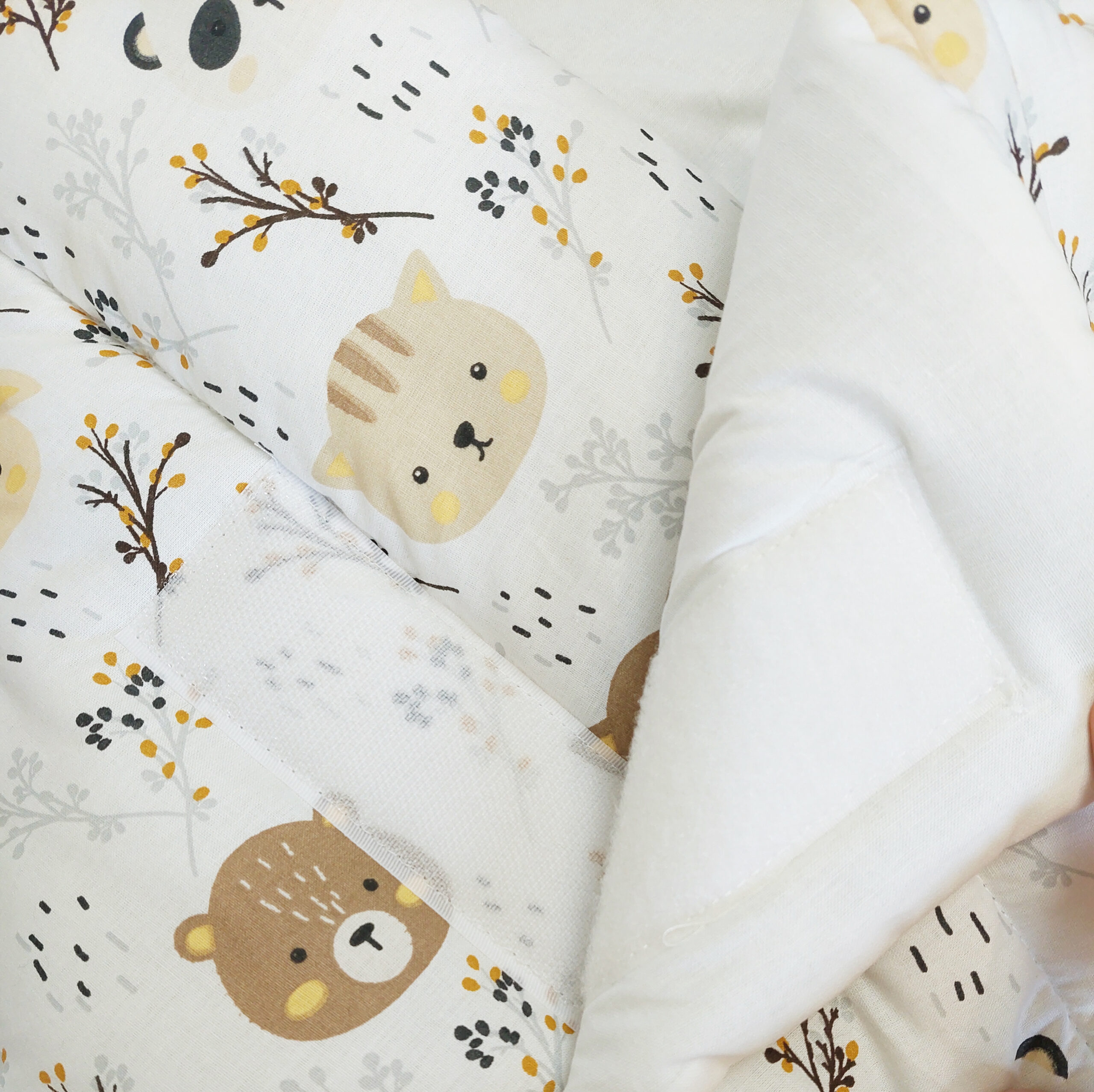 Jastuk se pričvršćuje na čičak, a rastvaranjem se pretvara u mekani prekrivač ili podlogu za prematanje i igru.