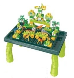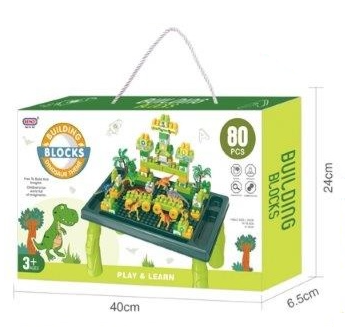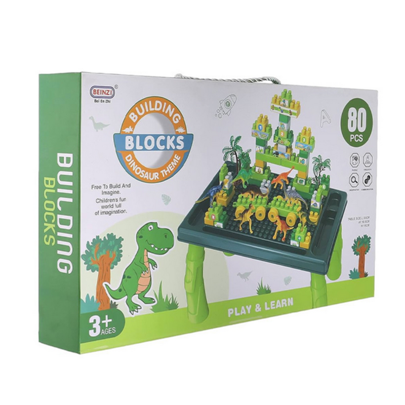 Stol s temom dinosaura dolazi s čak 80 šarenih plastičnih dijelova koje dijete može slagati, povezivati i kombinirati na bezbroj načina.